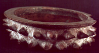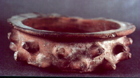 Plato con picos que se localizan en dos filas y de forma alterna. El borde es recto vertido, labio biselado y redondeado, pared vertical y base plana. Baño de pintura blanca en toda la superficie externa y a 1.5 cm, desde el borde hacia la superficie interna.