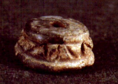 Malacate de forma trapezoidal, con incisiones que forman diseños triangulares en su circunferencia. Los bordes (superior e inferior) son redondeados. La base y la superficie superior son planas.