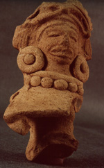 Fragmento de figurilla antropomorfa, posiblemente femenina. Se observa en el tocado semicircular, una cinta en forma de 8 al centro de éste y por debajo de la cinta, el cabello que cae en la frente. Los ojos abiertos, la nariz se ha perdido, la boca abierta y quizás sonriente. Dos orejeras de forma circular y…