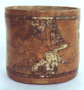 Vaso de pared recta, borde redondeado, base plana. Decoración abajo del borde: una banda de color blanco, enmarcada por líneas negras. El diseño principal es un personaje sentado de perfil izquierdo con los brazos cruzados, taparrabo blanco, tocado alto de trenzas en blanco, de la boca del personaje salen dos diseño que posiblemente dan la…