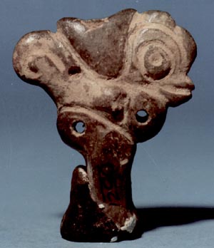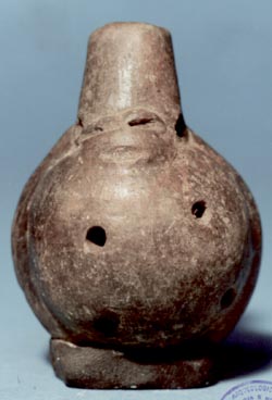Figurilla-silbato, posiblement un ave. Boquilla sobre la cabeza, cuatro agujeros de salida de aire sobre el vientre, el cual es protuberante.