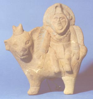 Figurilla silbato que representa un personaje sentado sobre un animal. El personaje lleva un tocado de un pájaro con plumas alrededor de la cabeza, y en los brazos, muñequeras. Tiene además collar de cuentas y taparrabo. La boquilla está en la parte de atrás del animal, y tiene un agujero de salida de aire en…