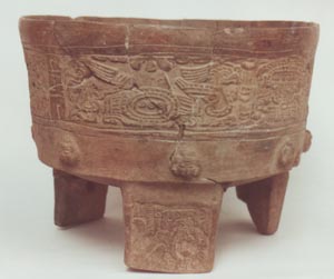 Cuenco de pared recta, base trípode, borde redondeado, soportes cuadrados huecos. Decoración: los soportes tienen decoración en bajo relieve de un personaje zoomorfo, con cola, manos y patas largas, tocado muy elaborado, ojos redondos. En la parte media del cuerpo hay una banda horizontal que va a todo alrededor del cuenco. En su interior hay…
