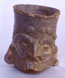 Vaso antropomorfo, de pared curvo divergente, borde redondeado, base plana. Decoración: rostro de un personaje anciano, con orejeras, cuatro aplicaciones sobre la frente. Atrás de las orejas presenta un diseño en inciso grueso. Pertenece a la vajilla plomiza.