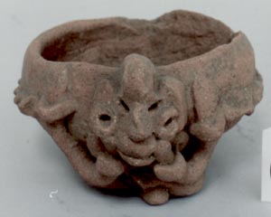 Cuenco de pared curvo convergente, base cóncava, borde redondeado. Decoración: personaje sentado con las piernas cruzadas, sosteniendo su cabeza con las manos. Presenta una pestaña medial en forma de lazo, orejeras, muñequeras. El cuerpo del personaje está en relieve.
