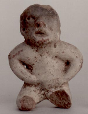 Figurilla sentada con las manos sobre el vientre, ojos excisos, boca entreabierta, nariz pequeña.