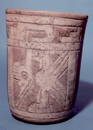 Vaso de pared recta, base plana, borde redondeado. Decoración: cuatro páneles, dos de los cuales presentan un diseño de un ave de cuello y pico largo. El ave tiene la cabeza agachada, ya que el tamaño del cuadro no es lo suficientemente alto como para tenerlo hacia arriba. El diseño es en inciso grueso, y…