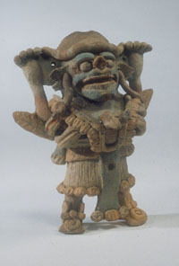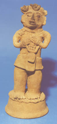 Tapadera de urna, representa un personaje de pie con las manos sobre el pecho, con taparrabo, tocado con la técnica de pastillaje, sobre el hombreo izquierdo un diseño de pastillaje al igual que sobre el vientre, en la parte de atrás del personaje se puede apreciar el diseño de un collar y el taparrabo. La…