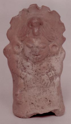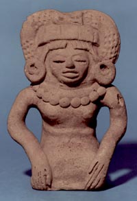 Figurilla hueca, representa una mujer sentada. Decoración: tocado en forma de aleta, diseños de arrugas en los brazos, falda larga, busto descubierto, una joroba en la espalda, el rostro da la impresión de una anciana. Vajilla Tiquisate.