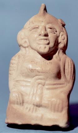 Figurilla antropomorfa, personaje sentado con las manos sobre las rodilla, ojos excisos, boca entreabierta, orejas y nariz grandes, ombligo en el vientre, tocado en forma de copete.