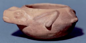 Cuenco zoomorfo, pared curvo convergente, base ligeramente convexa, borde redondeado. Decoración: representa la figura de un sapo, con la cabeza en relieve y las ancas en bajo relieve.