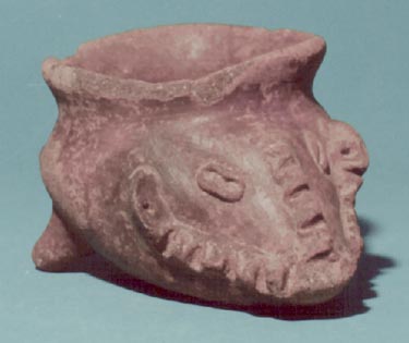 Vasija en forma de zapato, base plana, cuerpo subglobular alargado. Decoración: rostro zoomorfo, dos soportes.