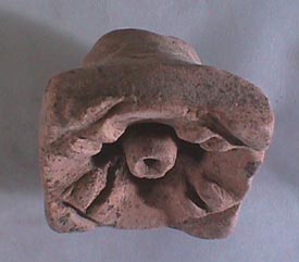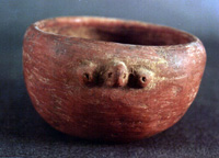 Cuenco de borde convergente, labio redondeado, cuerpo de paredes curvo-convergentes y base ligeramente remetida. Presenta tres aplicaciones en la superficie: simulando los ojos y la nariz de un rostro.. La pasta de coloración café claro, está recubierta de un engobe café-rojizo.