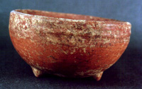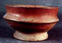 Cuenco bícromo con tres soportes en la base. De borde divergente, con acanaladura cercana al borde. El labio es agudo con bisel exterior. Todas las superficies con pintura naranja. A partir del borde, una franja de pintura roja de aproximadamente 2cm. de grosor en las superficies interna y externa.