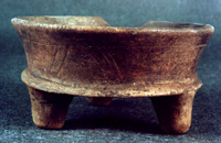 Plato de borde divergente y labio redondeado. Presenta tres soportes cónicos, superficie lisa y decorada con incisos que forman diseños geométricos (líneas inclinadas paralelas). Moldura basal.