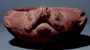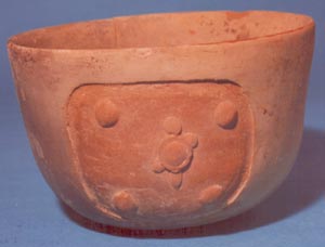 Cuenco zoomorfo, pared curvo convergente, base plana, borde redondeado. Decoración: efigie de un sapo en relieve, patas delanteras sobre el cuerpo, patas traseras se encuentran cerca del borde.