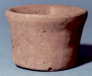 Cuenco de pared recto divergente, base ligeramente convexa, borde redondeado. Decoración: seis aplicaciones en forma de botón abajo del borde, separadas a una distancia de 2 a 3 cm. cada una.