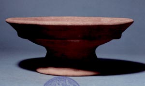 Cuenco de pared recta, base trípode, soportes tubulares, borde redondeado. Decoración: pestaña basal, evidencia de estuco.