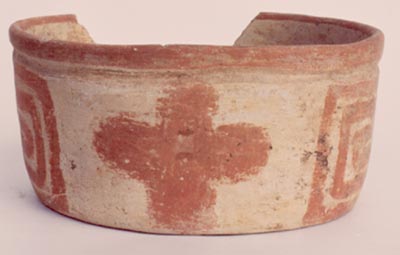 Cuenco de pared recta, base plana, borde redondeado. Decoración: borde pintado de rojo, cuatro páneles en rojo, dos con diseños de espiral rectangular, y los otros dos diseños de cruz “+”, pintados sobre un fondo blanco.