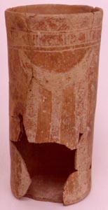 Vaso de pared recta, base plana, borde agudo. Decoración: abajo del borde diseños de triángulos ashurados, abajo de ellos diseños de rectángulos en insico medio. Diseño pricipal pintado de rojo: dos páneles con un diseño de media luna de la cual salen 3 bandas verticales.