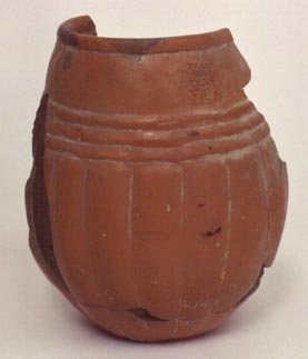 Cántaro de pared globular, base cóncava, cuello curvo divergente. Decoración: dos líneas incisas abajo del cuello, y en la pared diseños incisos de arcos.