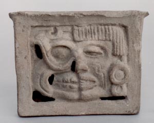 Soporte cuadrado. Decoración: simboliza la vida y la muerte, representa el rostro de un personaje con la mitad de la cara con vida y la otra calavera.