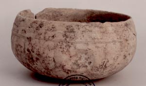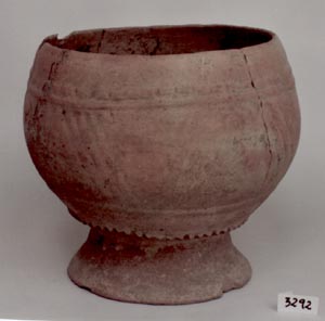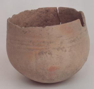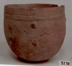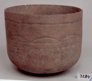 Cuenco de pared recta, base cóncava, borde redondeado. Decoración: diseños en inciso grueso abajo del borde y en la pared exterior en forma de arcos.