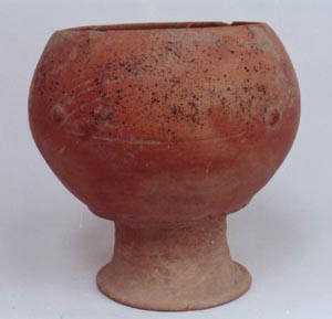 Tecomate de pared globular, borde restringido, base trípode, soportes mamiformes. Decoración: diseños en rojo y negro, que no se pueden distinguir por erosión.