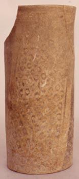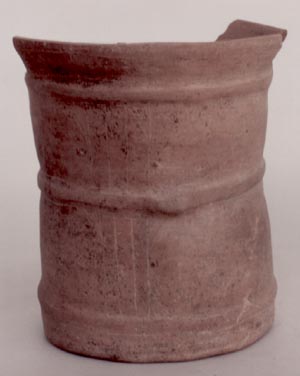 Vaso de pared recta, borde evertido, base plana. Decoración: moldura labial y basal, diseños geométricos en inciso fino. Donación: Joya Hairs, 29/12/82.