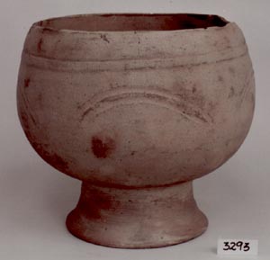 Cuenco de pared curvo convergente, borde redondeado, base pedestal. Decoración: una moldura abajo del borde, cuatro acanaladuras en forma de arco.