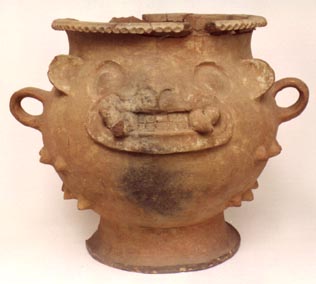 Urna funeraria, pared globular, base pedestal, borde evertido. Decoración: rostro antropomorfo, representación de jaguar, protuberancias en forma de púas a los lados, dos asas redondas, presenta decoración digital en el borde.
