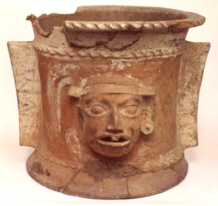 Urna de pared recta, base pedestal, borde evertido. Decoración: rostro antropomorfo en relieve, con orejeras, ojos grandes tocado de plumas. Se pueden observar los dos incisivos, pintura blanca en el borde, asas y parte de la pared, diseños en forma de lazo en el borde y cerca del rostro, asas alargadas verticales.