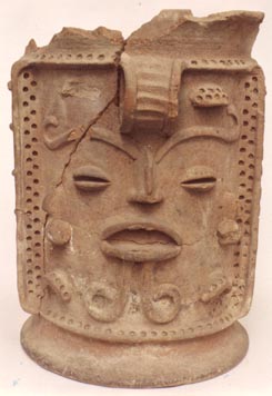 Urna de pared recta, base pedestal, borde evertido. Decoración: rostro antropmorfo, con la boca abierta y abajo de la boca dos volutas, orejeras, ojos en forma de granos de café, cejas en forma de volutas, alrededor del rostro y en las asas diseños de agujeros en fila, un asa al frente, a los lados de…