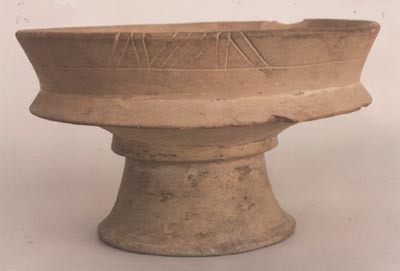 Plato de pared recto divergente, borde redondeado, base pedestal. Decoración: pestaña basal, abajo del borde diseños incisos de líneas verticales e inclinadas.