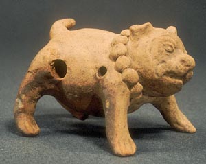 Figurilla-silbato, representa un perro parado en sus cuatro patas, con la cabeza hacia un lado, el cuerpo del perro es bastante obeso, la cola hacia el lado izquierdo, se observan sus genitales masculinos. Decoración: collar de cuentas con la técnica de pastillaje. Tiene dos agujeros al lado derecho.
