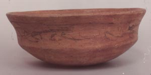 Cuenco de silueta compuesta, borde evertido, base plana. Decoración: en la pared exterior diseños en negro y rojo, en la pared interior diseño esgrafiado, en el fondo de la pieza un diseño que representa los cuatro vientos.