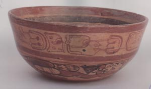 Cuenco de pared curvo divergente, base plana, borde redondeado. Decoración: en la pared exterior una banda roja abajo del borde, seguida por una banda de glifos con los motivos A, B, A, cuatro cabezas con diferentes formas de afijos, abajo de estos diseños dos en posición ventral, con brazaletes y tobilleras. Los personajes están pintados…