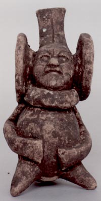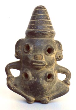Figurilla-silbato, representación zooantropomorfa, con tocado en forma de sombrero, orejeras, cuatro agujeros en el frente, boquilla en la parte de atrás.