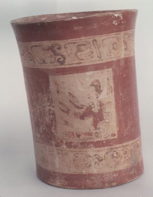 Vaso de pared ligeramente curvo divergente, base plana, borde Plano. Decoración: abajo del borde una banda roja abajo del borde, seguida por una banda crema enmarcada por dos líneas negras, abajo de ellas dos páneles con dos personajes sentados de perfil con taparrabo color crema, piernas y pecho pintados de negro, orejeras, muñequeras, tocado alto,…