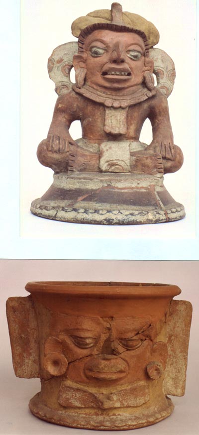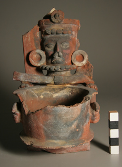 Incensario antropomorfo, representa un personaje sentado con las piernas cruzadas, con las dos manos sostenine un cuenco. Decoración: orejeras, pectoral con la técnica de pastillaje, nariguera, tocado alto, brazaletes, asas verticales alargadas.