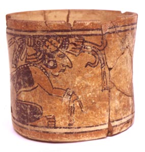 Vaso de pared recta, borde ligeramente evertido, base plana. Decoración: cuatro páneles, dos de ellos representan personajes antropomorfos sentados de perfil, uno de ellos tiene ambos brazos hacia el frente, el otro únicamente el brazo derecho al frente, el izquierdo sobre el vientre. El personaje parece estar hablando ya que de su boca salen unas…