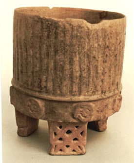 Vaso de pared recta, borde redondeado, base trípode, soportes cuadrados con agujeros. Decoración: acanaladuras verticales alrededor de la pared, cerca de la base diseños zoomorfos posiblemente pájaros en bajo relieve.
