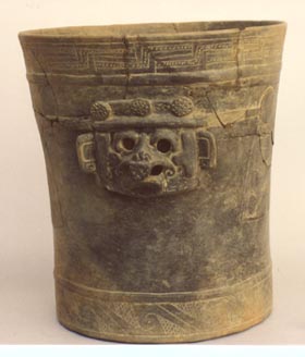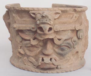 Urna funeraria, de pared recta, base pedestal. Decoración: zooantropomorfa, representa el rostro de un personaje emergiendo de las fauces de un monstruo de ojos blancos con orejeras y tocado de jaguar. De la boca del personaje humano salen unas volutas y un diente en el centro. El borde y la base tienen una decoración de…