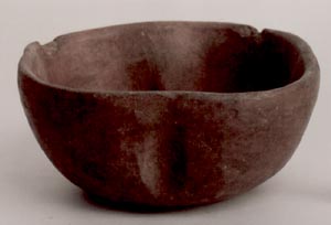 Cuenco de pared curvo convergente, base plana, borde con bisel interno. Decoración: el cuenco es casi cuadrado, con 4 hendiduras.