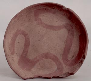 Plato de pared recto divergente, borde redondeado, base convexa. Decoración: borde pintado de rojo, diseños de líneas en rojo en el fondo del plato.