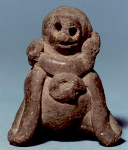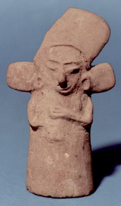 Figurilla femenina de pie con las manos sobre el vientre. Decoración: tocado alto, orejeras. Donación: Lic. Sergio García Granados.