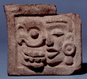 Soporte cuadrado. Decoración: un pánel que representa un rostro antropomorfo dividido en dos partes, en el lado izquierdo presenta un personaje con el ojo cerrado, boca entreabierta, orejeras; el lado derecho es el rostro del mismo personaje con la diferencia que se encuentra descarnado. La representación del pánel representa la vida y la muerte. Donación:…