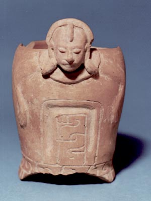 Vaso de base pedestal, pared curvo convergente, borde redondeado. Decoración: rostro de personaje en relieve, tocado en forma de diadema, orejeras, ojos cerrados, boca cerrada, manos a los lados. Abajo de la cabeza hay un diseño inciso rectangular. La base se encuentra decorada con inciso en forma de volutas. Donación: Lic. Sergio García Granadados.