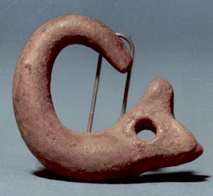 Figurilla antropomorfa, representa una serpiente con las fauces abiertas, cola orqueada. Un agujero representa los ojos.