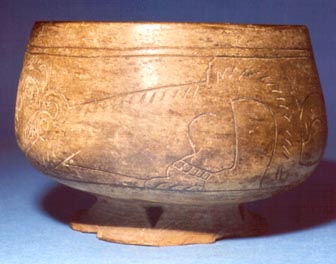 Cuenco de pared curvo convergente, borde redondeado, base pedestal con agujeros en forma de triángulos. Decoración: abajo del borde dos líneas incisas y abajo de ella diseños de rostros antropomorfos de perfil. Pieza donada por el señor Angel Cordón el 25 de abril de 1984.